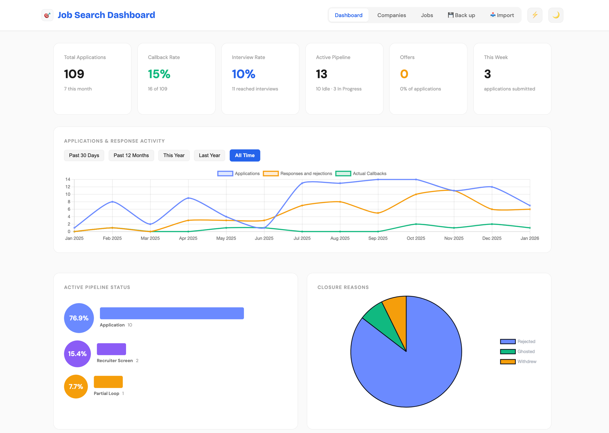 With this structure, we get some useful analytics. Response rate measures jobs that moved beyond "Applied." Pipeline health shows distribution across interview stages. Closure patterns reveal whether you're getting rejected, ghosted, or withdrawing.